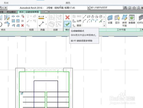 使用對齊工具將樓梯邊線對齊到就近的剪力墻,點擊對齊按鈕,然后先點擊樓梯邊線要對齊到的位置,然后點擊樓梯邊線,完成樓梯邊線與墻的對齊。之后,點擊完成編輯模式的對勾,完成繪制。