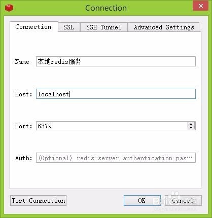 輸入連接名稱,輸入Host主機名稱或地址,輸入端口號,默認6379端口,Auth是密碼字段,如果redis服務器設置了密碼驗證,則需要填寫,沒有設置,為空即可