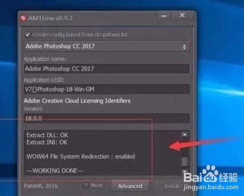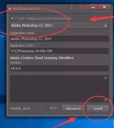 打開PS CC 2018破解文件夾,找到“Adobe破解工具.exe”,鼠標右擊選擇【以管理員身份運行】,如下圖所示,選擇Adobe Photoshop CC 2017,再點擊【Install】