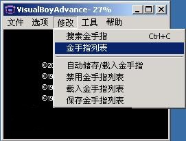 1、首先打開(kāi)GBA模擬器中文版,載入GBA游戲,因?yàn)槿绻麤](méi)運(yùn)行游戲的話,金手指是不能使用的。之后點(diǎn)擊“修改”,在彈出的下拉菜單中選擇“金手指列表”(如圖)。