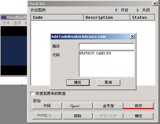 6、最后一個(gè)按鈕“修改” 點(diǎn)擊它后,便會(huì)彈出這個(gè)窗口(如圖)?!懊枋觥笨蓪懣刹粚憽T凇按a”欄中輸入金手指的格式是“xxxxxxxx xxxxxxxx”,也就是8個(gè)數(shù)字/字母+空格+8個(gè)數(shù)字/字母。注意別漏了中間的空格。輸入完畢后點(diǎn)擊“確定”即可。 說(shuō)到這里,如何輸入金手指就已經(jīng)說(shuō)完了。如果大家還是不知道哪種金手指要往哪輸入的話,就請(qǐng)把要輸入的金手指往每個(gè)按鈕都試一下,一定有一個(gè)可以輸入的。因?yàn)橛泻芏嘟鹗种覆豢赡苊恳粭l都告訴大家該往哪輸入,主要是讓大家懂得一個(gè)方法。
