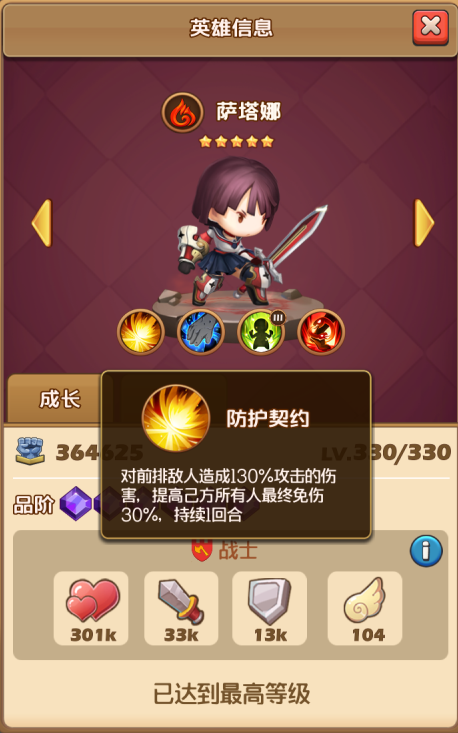 先不說技能1各種特效和50%防御加成。僅僅是第二技能:每回合50%幾率獲得1個最大生命+20%的護盾,持續(xù)1回合。就明白這位一哥有多肉了。本來就是先天成長最高的T,還加成50%防御,還有50%概率獲得20%生命的護盾。同星級,橫掃其他T,肉到對面哭都可能只能剛好破盾,然后奶一下,立刻滿血。技能3的加生命15%雖然常規(guī),卻是核心技能之一。技能4受到攻擊降低攻擊者20%攻擊,持續(xù)2回合。簡單的一個技能卻讓對面集體上了個攻擊降低20%2回合的BUFF,簡直不要太霸道。