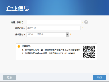 按要求填寫(xiě)納稅人識(shí)別號(hào)、單位全稱和行政區(qū)劃,完成企業(yè)信息注冊(cè)。