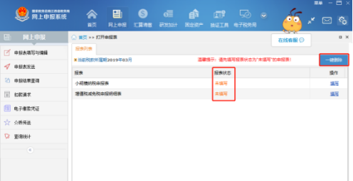 點(diǎn)擊左側(cè)菜單欄“申報(bào)表填寫(xiě)與編輯”,選擇報(bào)表狀態(tài)為“未填寫(xiě)”的報(bào)表,按照?qǐng)?bào)表邏輯順序進(jìn)行填寫(xiě),表間已自動(dòng)將發(fā)票數(shù)據(jù)匯總填入,僅需手工補(bǔ)充部分?jǐn)?shù)據(jù)即可。因未歸集發(fā)票數(shù)據(jù),小規(guī)模納稅人仍須全部手動(dòng)輸入報(bào)表數(shù)據(jù)。