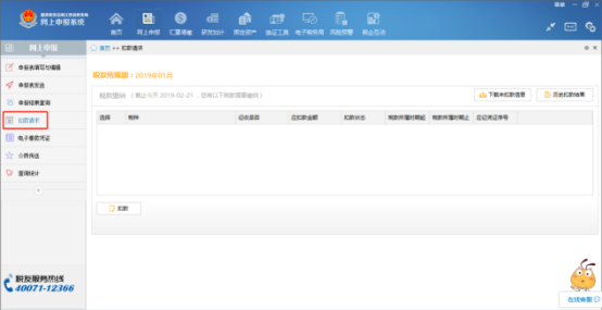 確認(rèn)申報(bào)成功后,可點(diǎn)擊左側(cè)菜單“扣款請(qǐng)求”進(jìn)行扣款,系統(tǒng)會(huì)自動(dòng)從稅局征管系統(tǒng)獲取待扣款信息,核實(shí)待扣款信息后,勾選中待扣款記錄并單擊扣款按鈕即可發(fā)起扣款。