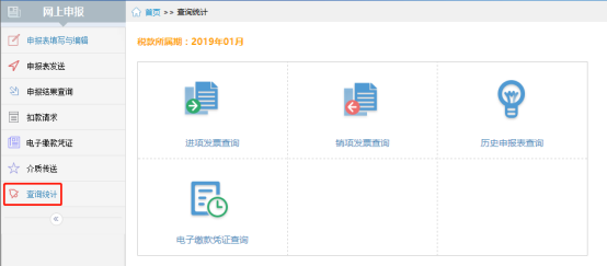 可進(jìn)行“進(jìn)項(xiàng)發(fā)票查詢”、“銷(xiāo)項(xiàng)發(fā)票查詢”、“歷史申報(bào)表查詢”、“電子繳費(fèi)憑證查詢”;