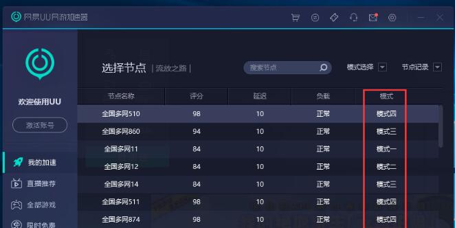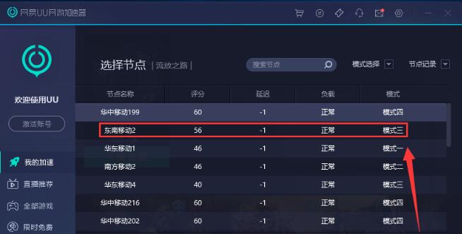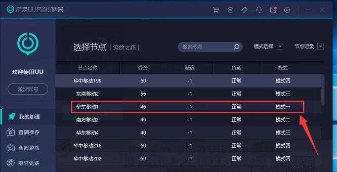 在網(wǎng)易UU網(wǎng)游加速器中我們可以點擊”節(jié)點“(啟動你的加速器,點擊加號,然后搜索你要加速的游戲,比如流放之路,接著定位到你的游戲安裝文件夾的啟動程序,加入加速器成功,最后鼠標放在選項圖片就可以打開節(jié)點選項了),然后在節(jié)點列表中可以看到各種模式,共4種模式,如下圖所示: