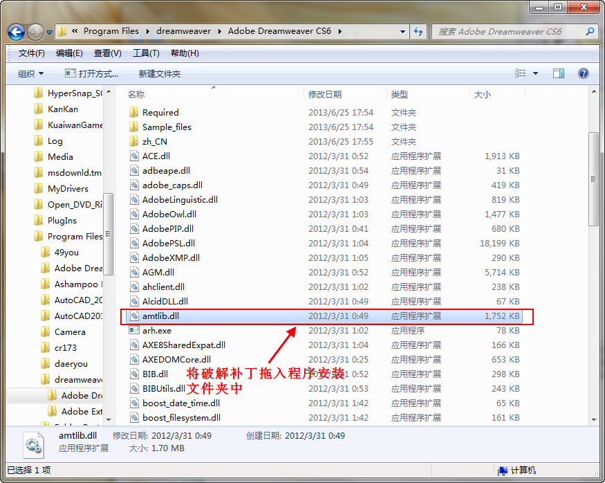 打開Dreamweaver cs6安裝文件夾,將適合自己系統(tǒng)的破解補丁文件夾中的文件拖入程序安裝文件夾中覆蓋同名文件