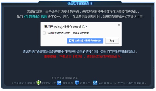 在您首次開始微端戰(zhàn)斗時,由于處于系統(tǒng)安全的考慮,任何瀏覽器打開外部程序均需要用戶確認(rèn),我們《生死狙擊》微端也不例外。所以,在您開啟微端戰(zhàn)斗時,如果瀏覽器彈出如下確認(rèn)內(nèi)容: