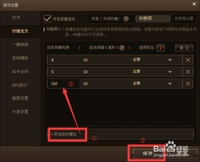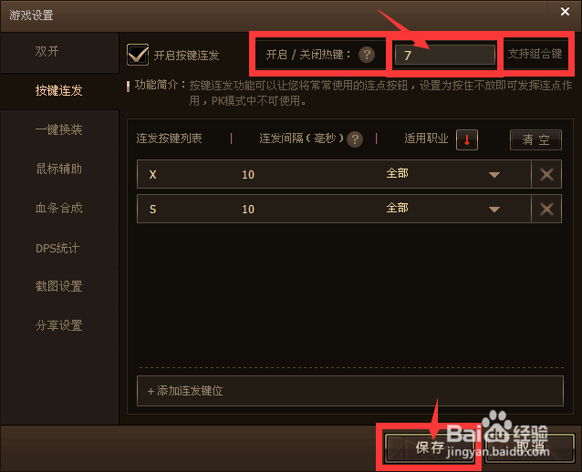 還可以設(shè)置開啟/關(guān)閉按鍵連發(fā)快捷鍵,支持組合按鍵。如:Ait+A等待組合按鍵