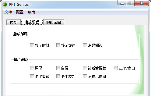 超時策略,可以選擇顯示的時鐘、提示鈴聲、密碼解鎖、黑屏、白屏、鎖播放屏幕、鎖PPT窗口、推出播放、推出PPT、不提示信息