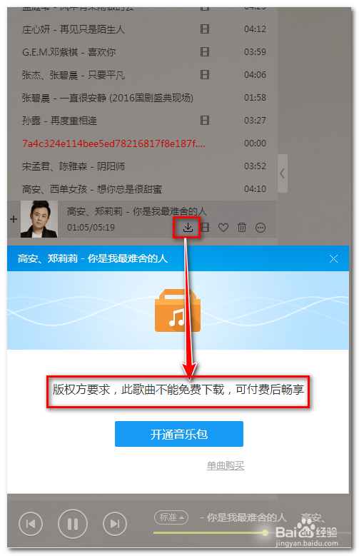 大家看看我在酷狗里找到的一首歌在試聽時,點(diǎn)擊下載出現(xiàn)提示【此歌曲不能免費(fèi)下載,可以付費(fèi)后暢享】