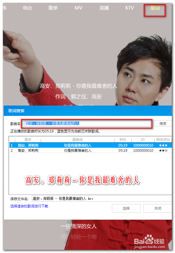 在酷狗中點(diǎn)擊右上角的【歌詞】在歌詞上點(diǎn)擊右鍵歌詞搜索。把歌曲名【高安、鄭莉莉 - 你是我最難舍的人】選中復(fù)制備用