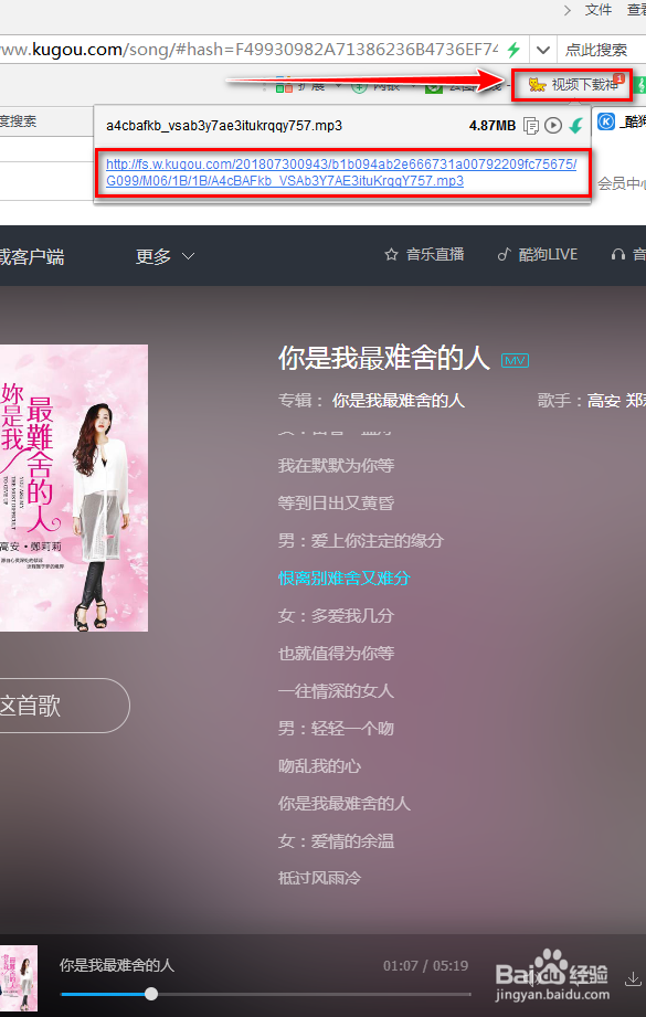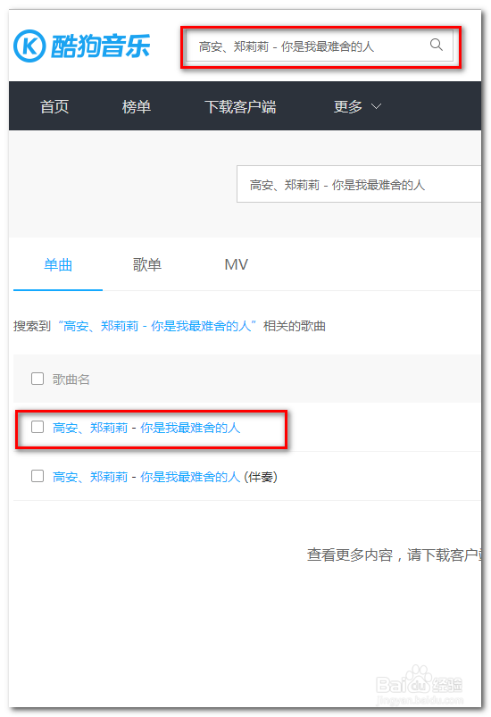 在【酷狗音樂-就是歌多 官網(wǎng)】的搜索欄中輸入我們剛才復(fù)制備用的歌名【高安、鄭莉莉 - 你是我最難舍的人】搜索。找到歌曲點(diǎn)擊開