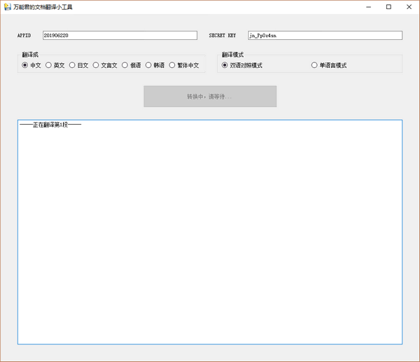 經(jīng)過上文,我們docx文檔也有了,key也填寫了,然后我們選擇目標(biāo)翻譯語言和模式即可,雙語對照模式就是翻譯好的文檔,原文與翻譯一一對應(yīng),比較適合閱讀學(xué)習(xí),單語言模式就是翻譯語言一種了。然后選擇docx文檔即可翻譯,等待翻譯完成,自當(dāng)保存翻譯好的文檔于軟件目錄下??纯捶g效果,以兩欄排版的論文效果為例。