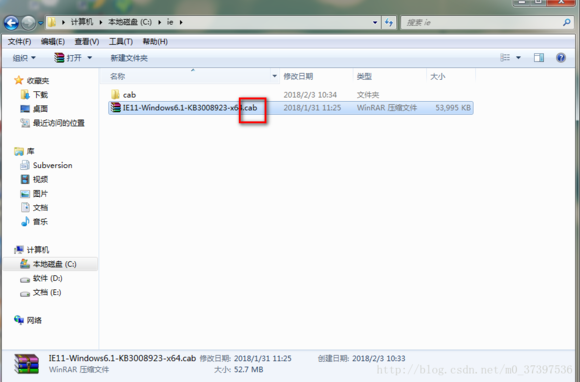 1、把IE11-Windows6.1-KB3008923-x64.msu的后綴名msu改為cab,然后解壓,注意解壓到一個新的文件夾中,不要在本文件夾中解壓(例如:我的解壓在cab文件夾中);