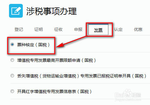 點擊【事項辦理】,頁面彈跳后,點擊【發(fā)票】項下的【票種核定】,再點擊最下方的【辦理】。