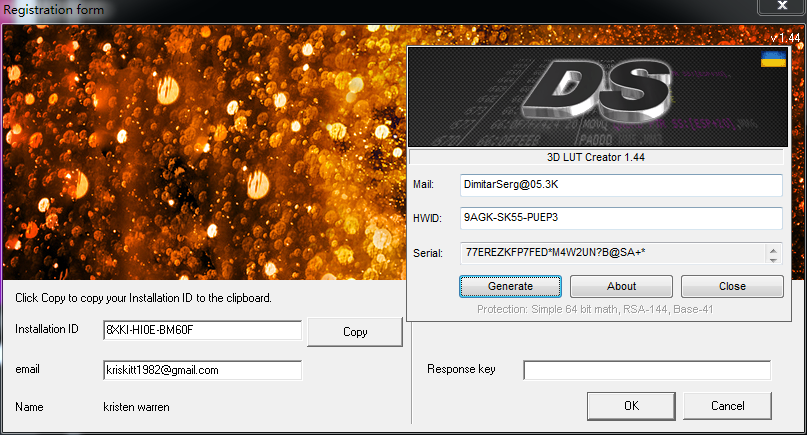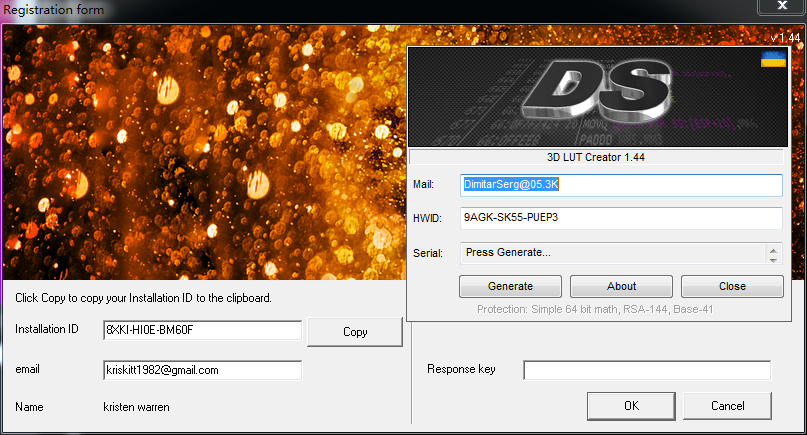 2、運(yùn)行注冊機(jī),如圖所示,將軟件中的Installation ID和郵箱對應(yīng)復(fù)制到注冊機(jī)中,點(diǎn)擊Generator生成注冊碼