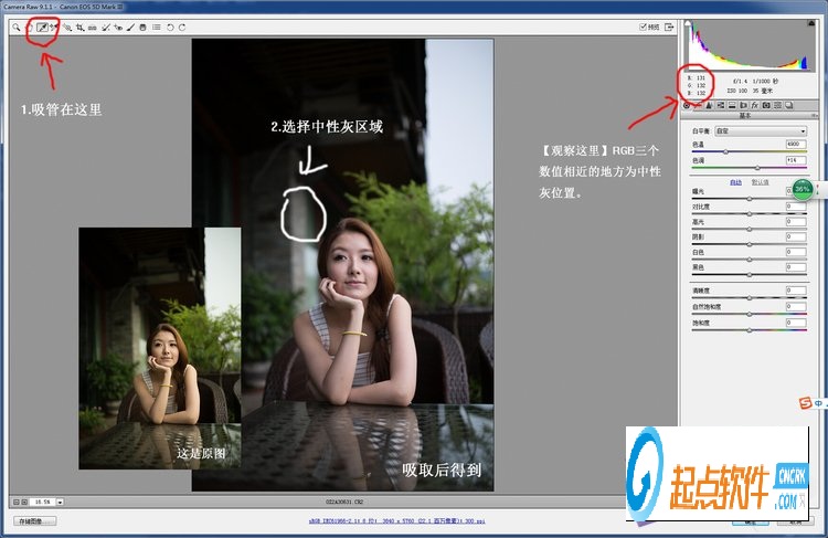 2.[重要] 選擇ACR里面的吸管工具 ,吸取一個(gè)圖片上灰色 的地方恢復(fù)白平衡 (最后可以適當(dāng)手動調(diào)節(jié)讓色溫偏中性 )