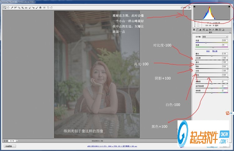 然后回到基本 ,調(diào)節(jié)對比度-100,高光-100,陰影+100,白色-100,黑色+100 觀察直方圖 ,呈現(xiàn)如圖所示的樣子,山峰位置可以通過曝光滑塊來控制。