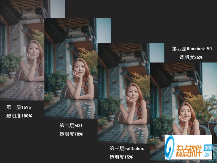 {在疊加之前我說明一下,一般來說,4層LUT是極限疊加層數(shù),越少越好,出效果需要不斷根據(jù)圖片對比度調(diào)試每個(gè)圖層的不透明度,來達(dá)到最終效果,以下是四層疊加的一個(gè)思路: