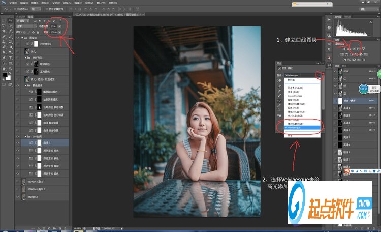 先建立第一個(gè)曲線圖層,載入之前安裝的Velviaesque 曲線預(yù)設(shè)(感謝英倫細(xì)雨龍總 圖蟲ID:Bonnieazuresky分享的Film Curves預(yù)設(shè))