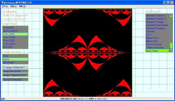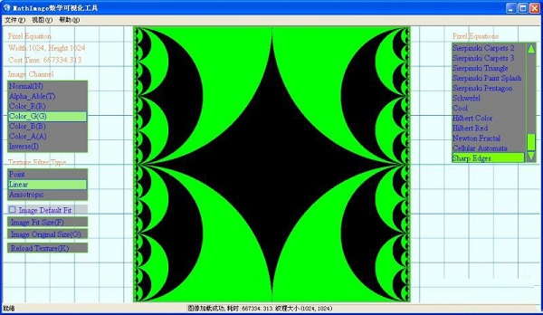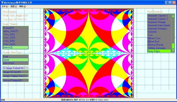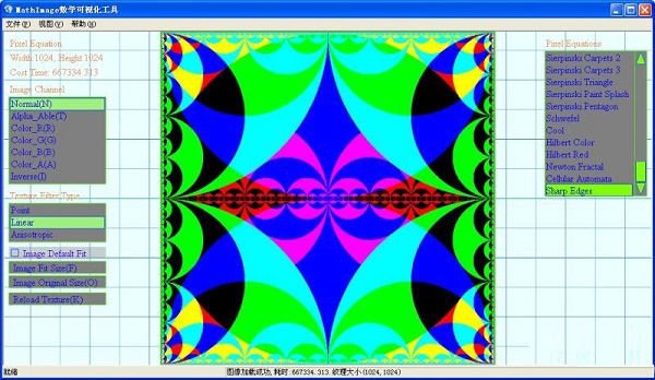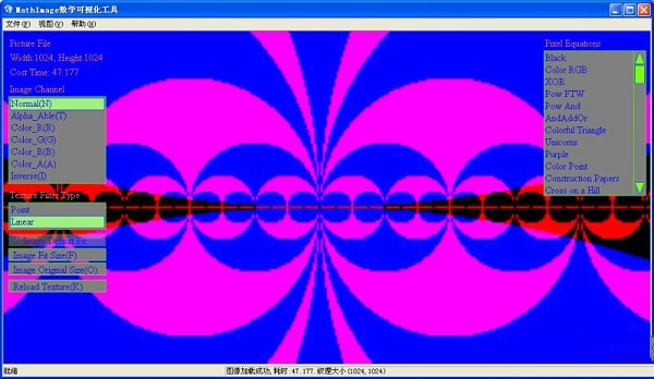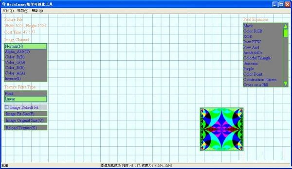 軟件中含有近百種數(shù)學(xué)圖像生成的算法,如Mandelbrot,JuliaSets之類(lèi)的分形算法。首先介紹下該軟件的基本功能,這是一款與圖像有關(guān)的軟件,所以圖像加載顯示功能是必需的,軟件支持的圖像格式有:jpg,jpg,dds,bmp,tga,ppm。用戶可以將文件直接拖入窗體內(nèi)以打開(kāi)圖像,也可以通過(guò)菜單項(xiàng)或快捷方式Ctrl+F選擇文件加載。下圖為軟件界面:
