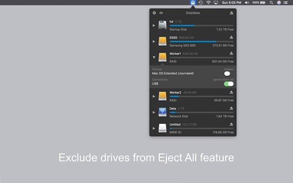 DiskMate Mac版支持配置全局快捷方式以彈出所有驅(qū)動(dòng)器,排除驅(qū)動(dòng)器彈出的所有功能。你可以從列表中隱藏驅(qū)動(dòng)器,參見列表中的總存儲(chǔ)空間和空閑空間。使用狀態(tài)欄圖標(biāo)輕松訪問驅(qū)動(dòng)器,所有的安裝,卸載都會(huì)以通知形式告知用戶。
