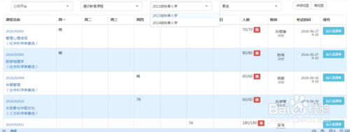 學(xué)院內(nèi)部選課就在下拉列表中點擊你所屬學(xué)院;全校素選課在下拉列表中找到“公共平臺”并點擊,而后依次在后三個列表選擇“通識教育課程”、“2013級/2014級入學(xué)”、“素選”。點擊后,頁面會自動跳出詳細(xì)課程列表。