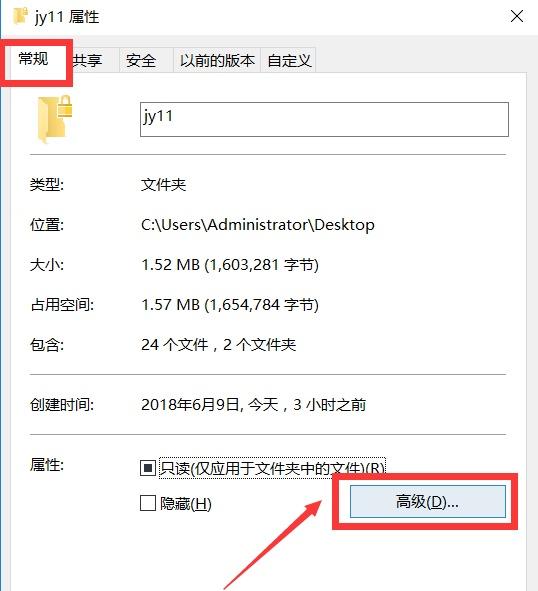 如果想在同一臺(tái)電腦中針對(duì)不同的賬戶進(jìn)行文件保護(hù)操作,則可以通過下面的方法來實(shí)現(xiàn)。右擊想要加密的文件或文件夾,選擇“屬性”窗口打開,切換到“常規(guī)”選項(xiàng)卡,點(diǎn)擊“高級(jí)”按鈕。