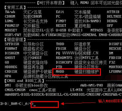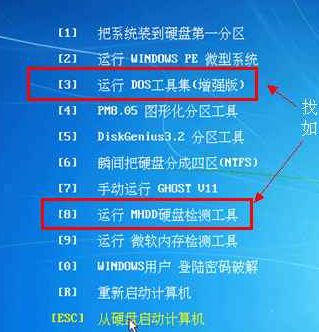 2、進入DOS工具集之后,如下圖所示,部分系統(tǒng)盤可能不一樣,但是幾乎找一下都會有MHDD硬盤掃描維護這個的。絕多數(shù)DOS工具集里都有這個的。