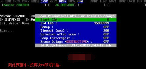 4、進入掃描硬盤的操作,這里有很多選擇。一般都是執(zhí)行運行SCAN命令??旖萱I是F4,但是一定要按兩次F4,按一次是不行的。按兩次之后就開始掃描上面所選擇的硬盤了。