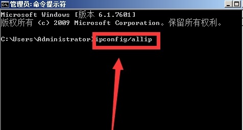 3、在命令提示符框內(nèi)輸入ipconfig /allip回車