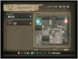 要點(diǎn):劍士很容易出必殺,沖到前邊殺幾個(gè)人,后面的再上來就頂不住了,所以還是步步為營(yíng),看好敵人的移動(dòng)距離再前進(jìn),最好不要走進(jìn)多個(gè)敵人的射程內(nèi)(在敵人身上按A可查看其行動(dòng)范圍,遙控器是按2鍵);藥草可用10次,不用留著,掉血就用吧;ミカヤ的特技『癒しの手』用指令發(fā)動(dòng),效果為消耗自身HP恢復(fù)同伴HP及異常狀態(tài)(自殘?),可以躲在后面給人加加血;BOSS用劍士上前承受兩次攻擊,再3人圍攻即可(吃個(gè)傷藥頂吧)