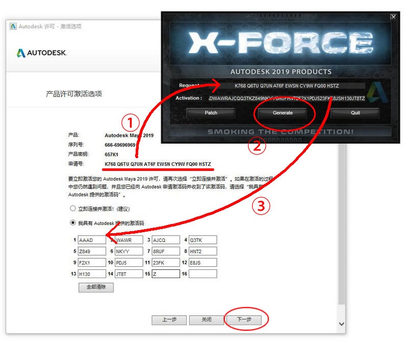 9、復(fù)制申請(qǐng)?zhí)柕阶?cè)機(jī)的上面的框中,再點(diǎn)中間的按鈕【Generate】,注冊(cè)機(jī)下框會(huì)生成激活碼,復(fù)制激活碼到軟件的激活框中,輸入完成后點(diǎn)擊【下一步】。