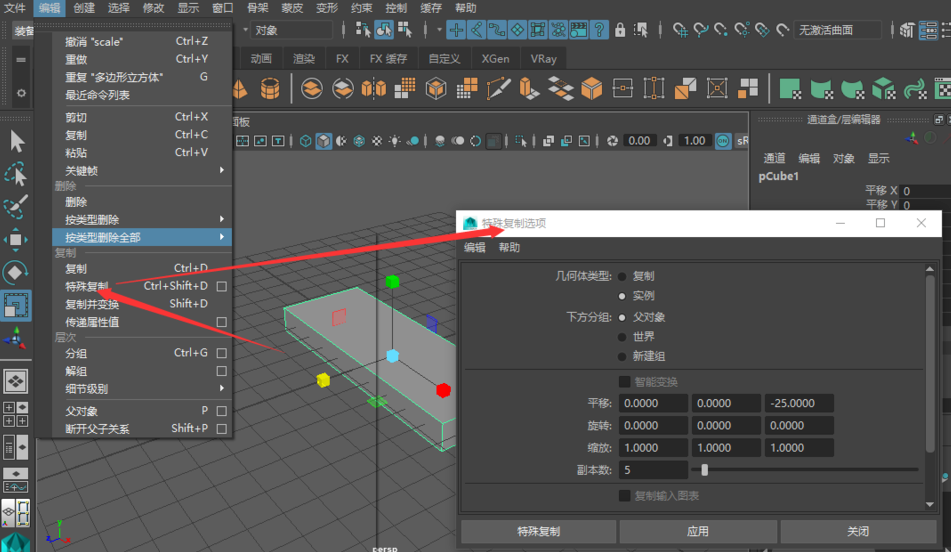 2、點(diǎn)擊瑪雅Maya菜單欄中的【編輯】在彈出的選項(xiàng)中點(diǎn)擊【特殊復(fù)制】,或者通過快捷鍵Ctrl+Shift+D打開特殊復(fù)制選項(xiàng)窗口。