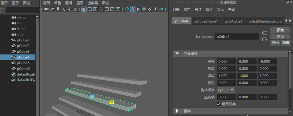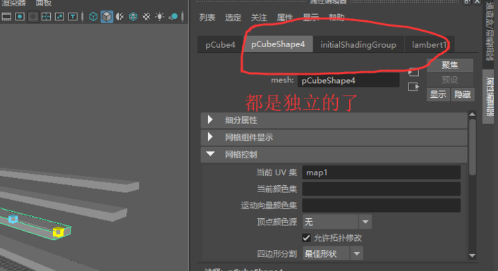 4、點(diǎn)選復(fù)制后的物體,在屬性編輯器中,您可以看到它們除了最后一個(gè)變換屬性是各自不同的,前面的pCubeShape1/polyCube1等等屬性,包括網(wǎng)格模型,材質(zhì)等,都是公用的。