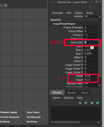 5、在圖片的的右側(cè)通道盒里可以調(diào)整圖片的透明度和大小等各種屬性。