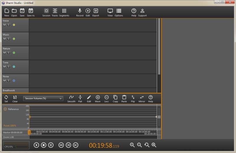 SHARM Studio是一款功能強(qiáng)大的音頻錄制編輯軟件。這款軟件包含一個(gè)內(nèi)置的聲音編輯器,可讓您輕松編輯錄制的聲音文件,還可以添加實(shí)時(shí)效果,如混響和回聲,創(chuàng)建有效,高質(zhì)量,工作室級(jí)別的音頻治療課程,為您的客戶在家里使用定制的背景音環(huán)境。該軟件的界面簡(jiǎn)潔,即使你是一個(gè)新手也很容易上手。【軟件功能】