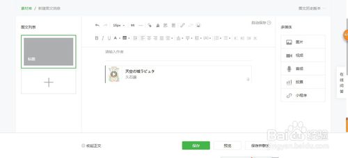打開(kāi)你的微信公眾號(hào)后臺(tái),進(jìn)入素材管理,新建圖文,把音樂(lè)粘貼上去(ctrl+v),這樣就完成了。接下來(lái)就是圖文消息的建立,下回有機(jī)會(huì)再說(shuō)。