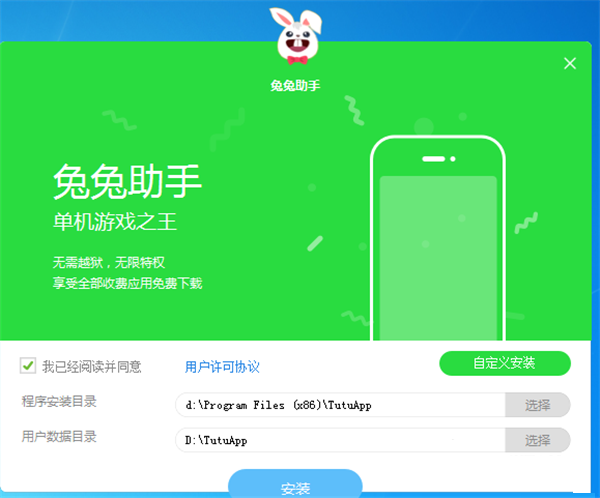 1、運行兔兔助手的安裝程序,點擊安裝,即可進行安裝,想修改安裝路徑,點擊自定義安裝。