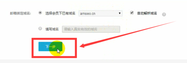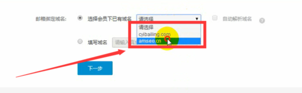 2.綁定郵箱域名,選擇會(huì)員下已有域名,再點(diǎn)擊下一步,如圖所示。