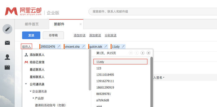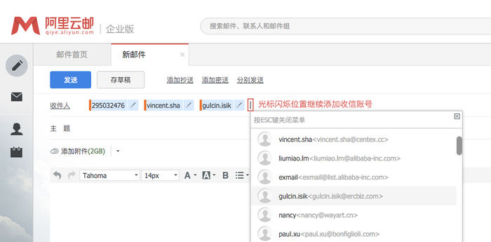 一、阿里郵箱企業(yè)版怎么群發(fā)郵件?阿里郵箱企業(yè)版群發(fā)郵件的方法1、編輯新郵件窗口,點(diǎn)擊“收件人”地址欄,會(huì)出現(xiàn)常用收件人聯(lián)想列表,同時(shí)也可以在輸入框中直接手工輸入添加多個(gè)聯(lián)系人