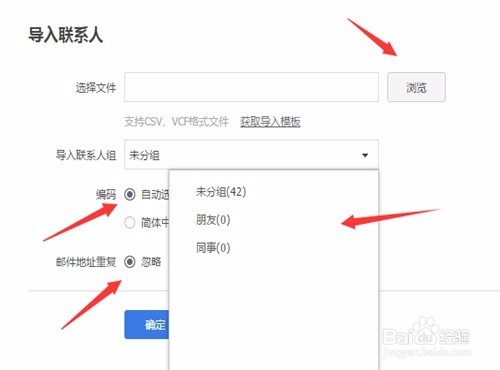 (1)選擇文件:點(diǎn)擊后面的“瀏覽”,找到上文中編輯好的通訊錄文件。
