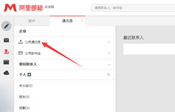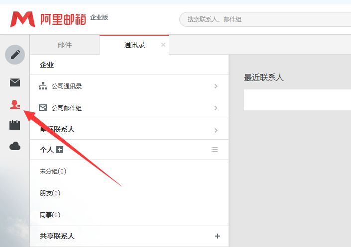 登錄阿里企業(yè)郵箱后,點(diǎn)擊位于左邊中部位置的“通訊錄”按鈕,進(jìn)入到通訊錄界面。