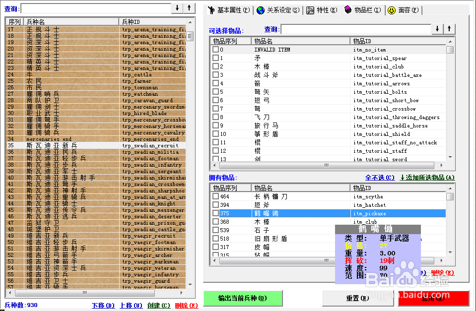 (1).給兵種添加物品時,單擊該欄即可選中,雙擊直接添加或刪除物品