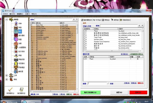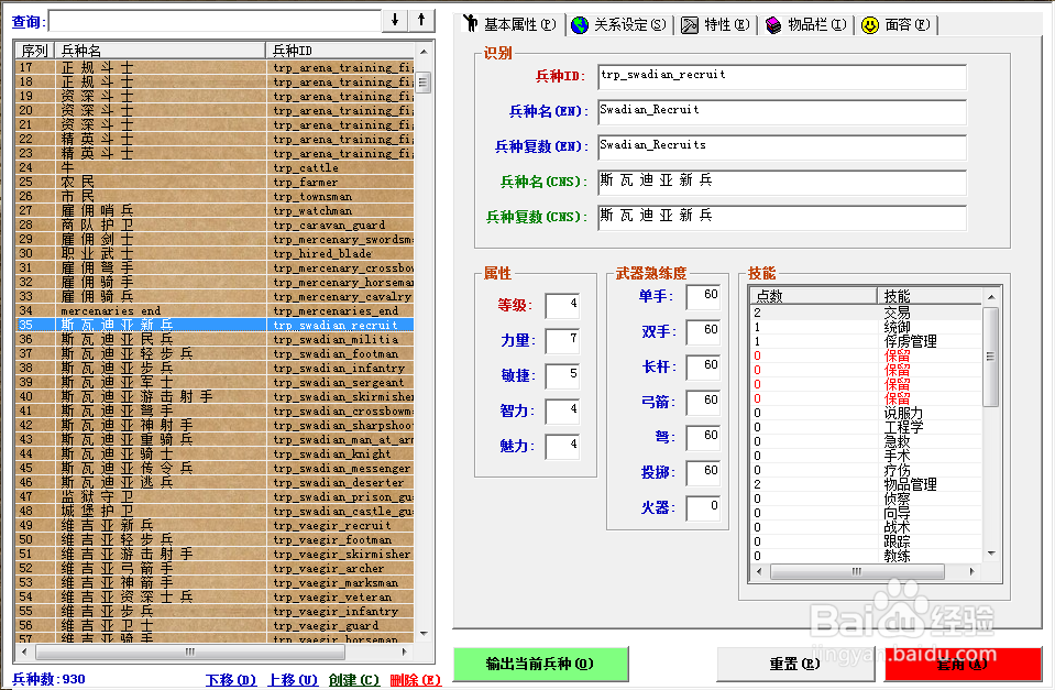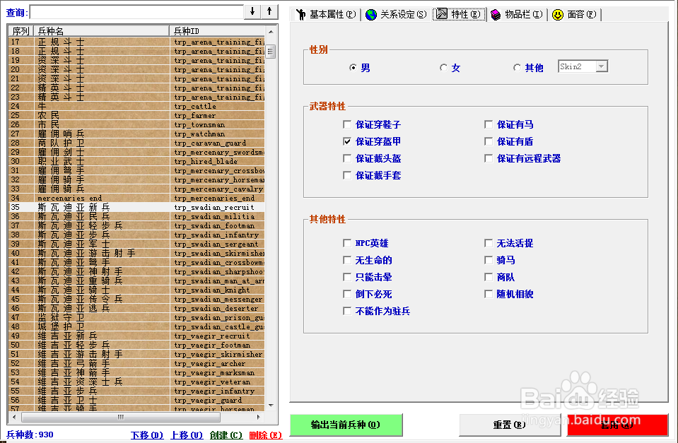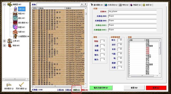基本屬性、關(guān)系、特性、物品、面貌來查看某個兵種的特性和上面的修改方法一樣修改,所有的都修改完畢了以后,點擊右下角紅色的套用