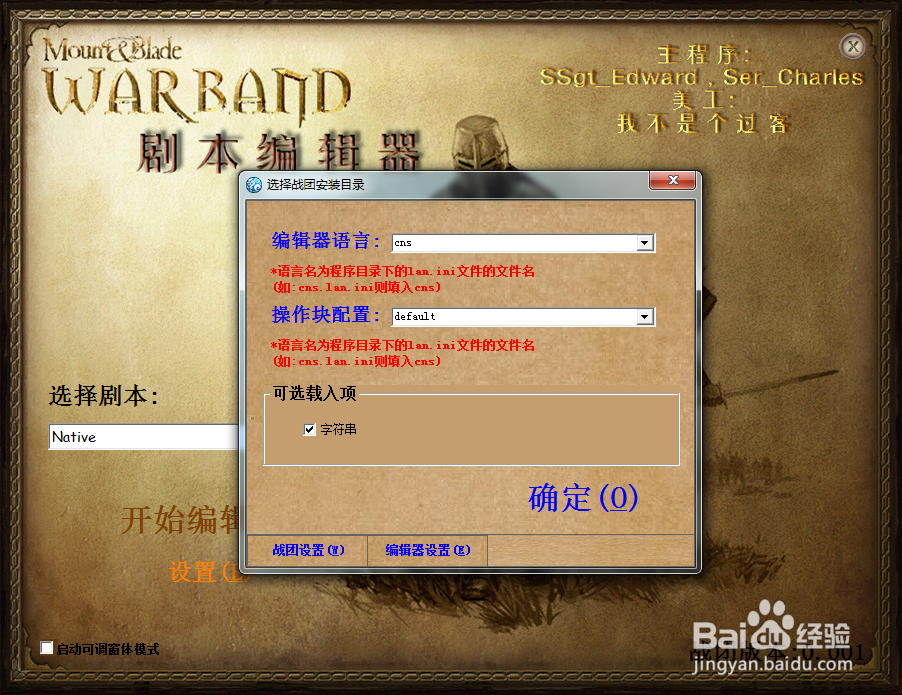 點擊"設(shè)置",選擇騎砍的安裝路徑;把語言設(shè)置為“cns”即簡體中文;版本號即你的騎砍戰(zhàn)團或者火與劍的版本號,一般來說是1.143或者1.153,注意把"."去掉。接著修改"編輯器設(shè)置",如果你發(fā)現(xiàn)你的編輯器語言不是CNS的話可以把它改回來.
