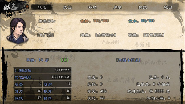 因?yàn)槌搜瞄T的任務(wù)有潛能獲得之外,其他NPC的任務(wù)并沒有,學(xué)好了基礎(chǔ)武功,把外功學(xué)到3級(jí)(外功每級(jí)加5的臂力)為拔金蛇劍做準(zhǔn)備(二代的金蛇對(duì)臂力的要求比較高需要二百,所以盡量把茶花菜刀的臂力刷高一點(diǎn),當(dāng)臂力超過一百的時(shí)候去客棧買酒,到地方喝醉,就可以拔了)。