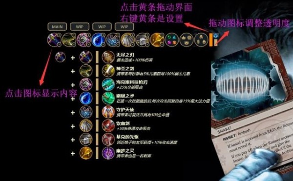 想要查看游戲內(nèi)容的話,點擊Main主菜單就可以呼出現(xiàn)有的功能,比如上圖的裝備預(yù)覽,可以看到對應(yīng)的裝備合成路線,即使是初次接觸游戲,也可以通過這個插件傻瓜式看懂了。為了對比內(nèi)容,我也是換了一個黑色底色的壁紙,大家可以看到,右上角那個河流精魄的小圖標,是可以控制預(yù)覽內(nèi)容的文件背景圖透明度,最上方則是黑色,最下方則是單純顯示圖片和文字。